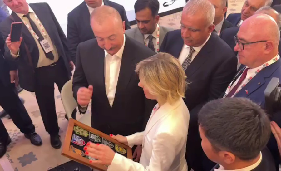 Президент Азербайджана Ильхам Алиев принял в подарок от украинской журналистки Олены Курбановой шевроны подразделений ВСУ. «Самое ценное, шевроны наших защитников», — сказала Курбанова. «Спасибо вам большое. Спасибо вам за то, что вы делаете. Продолжайте так же», — ответил Алиев. Вчера азербайджанский президент призвал украинцев к борьбе до победы.