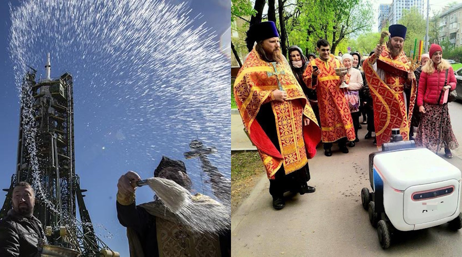 Что касается освящения предметов, то тут модернизм РПЦ зашкаливает. На днях в Москве священники храма Благовещения Богородицы освятили робота-доставщика во время крестного хода в Петровском парке. После того как информация просочилась в сеть, в храме начали увиливать от «киберкрещения». Сначала утверждали, будто это была личная инициатива отдельно взятого священника. Но на фото хорошо видно, что их трое, и все они принимают участие в этом священном деянии. Тогда появилась новая версия: дескать, ровер случайно попал под брызги святой воды. Но и это ложь. На том же фото видно, что бездушную железяку кропят целенаправленно.