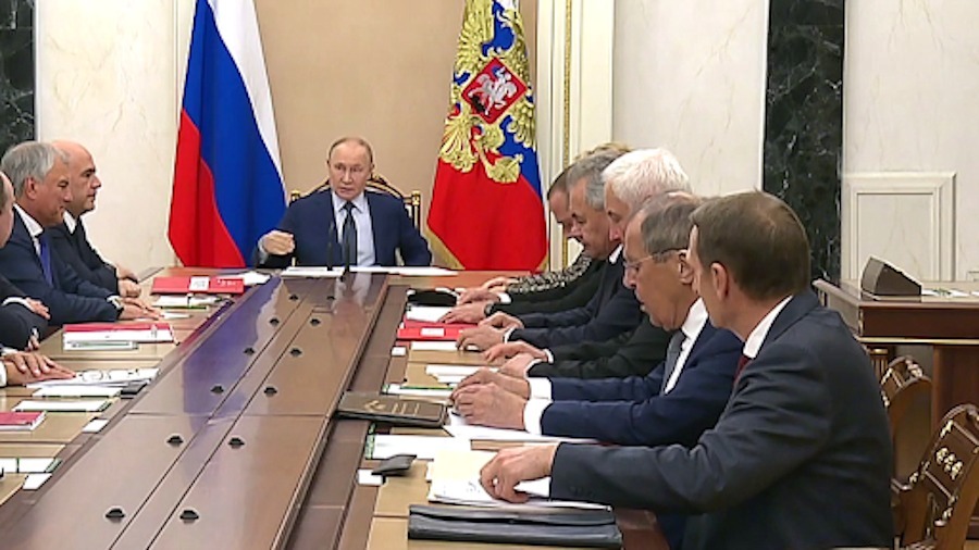«Давайте перейдём к текущей повестке дня. Слово Лаврову Сергею Викторовичу и Белоусову Андрею Рэмовичу», — закончил Путин оглашённую часть совещания. Кроме министров иностранных дел и обороны, в совещании участвовали премьер-министр Мишустин, председатели законодательных палат Матвиенко и Володин, формальный начальник путинской администрации Вайно, директора спецслужб Бортников и Нарышкин, спецпредставитель по природе Иванов, секретарь Совбеза Шойгу, придворный паяц Медведев… Повестка дня, от которой Путин отступил в геополитику, касалась, по его же словам, миграционной политики.