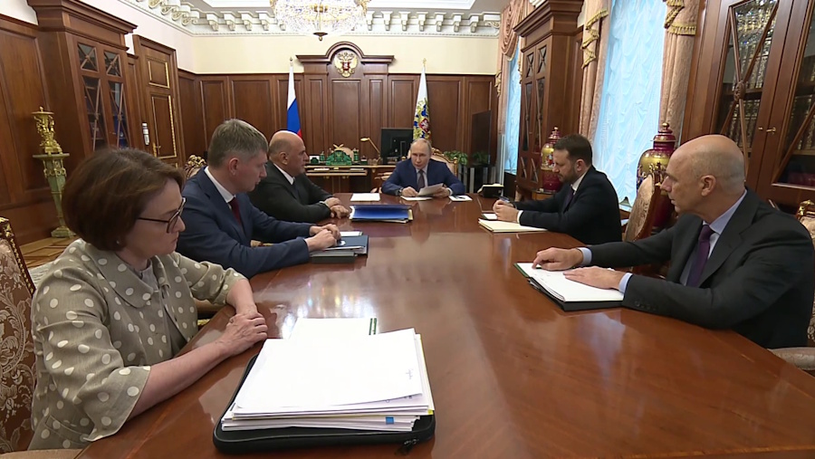 Глава РФ Владимир Путин провёл в Кремле экономическое совещание. Участвовали премьер-министр Михаил Мишустин, председатель Центробанка Эльвира Набиуллина, заместитель руководителя путинской администрации Максим Орешкин, министр финансов Антон Силуанов, министр экономического развития Максим Решетников. «Многие эксперты говорят о рисках чрезмерного охлаждения экономики, даже рецессии. Мы также с вами об этом говорили», — задал камертон Путин.