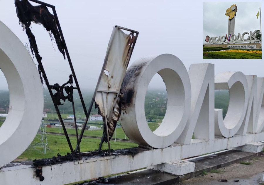 На стеле при въезде в Кисловодске подожжена буква V в названии города. Конструкция полностью выгорела, металлический каркас увезён на реставрацию. Литера V, наряду с Z – один из символов путинской войны против Украины. Заменой В на V «кислоvодская» администрация выражала сервильную лояльность Кремлю. Заметим, что «русская духовность» путинских чиновников шизофренически выражается в поклонении символам из латинского алфавита.