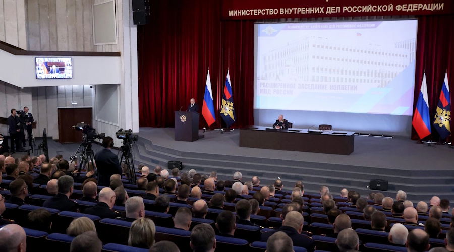 Владимир Путин выступил сегодня на коллегии МВД РФ. «Расширять профилактическую работу. Оперативно выявлять. Жёстко пресекать», — поставил диктатор задачи полицейскому ведомству. Конкретно по актуалу: «усилить безопасность во время избирательных кампаний». В принципе то же, что неделю назад озвучивалось им же на коллегии ФСБ. Но некоторая разница прослеживается. С гэбистской элитой Путин говорил об охране самих себя. Полиции отдаёт более полевые приказы. Место знают тут и там.