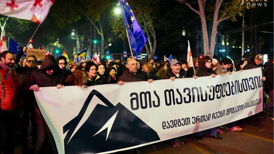 В годовщину начала грузинских проевропейских протестов тысячи людей вышли на демонстрацию в Тбилиси. Шествие двинулось с проспекта Чавчавадзе к зданию парламента на проспекте Руставели. Развеваются национальные флаги Грузии и символы Евросоюза. Впереди колонны большой плакат: «Год непрерывного сопротивления» «До конца! Режим – в отставку!» – скандируют демонстранты.